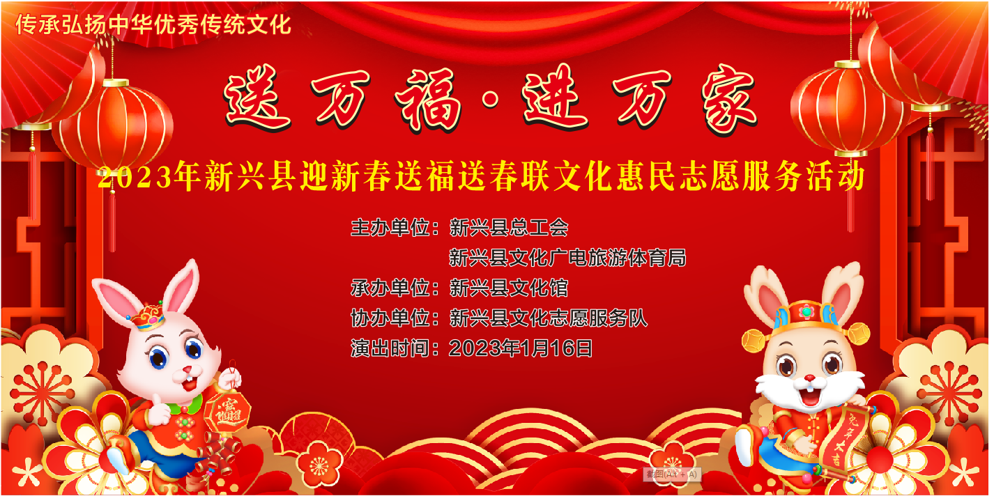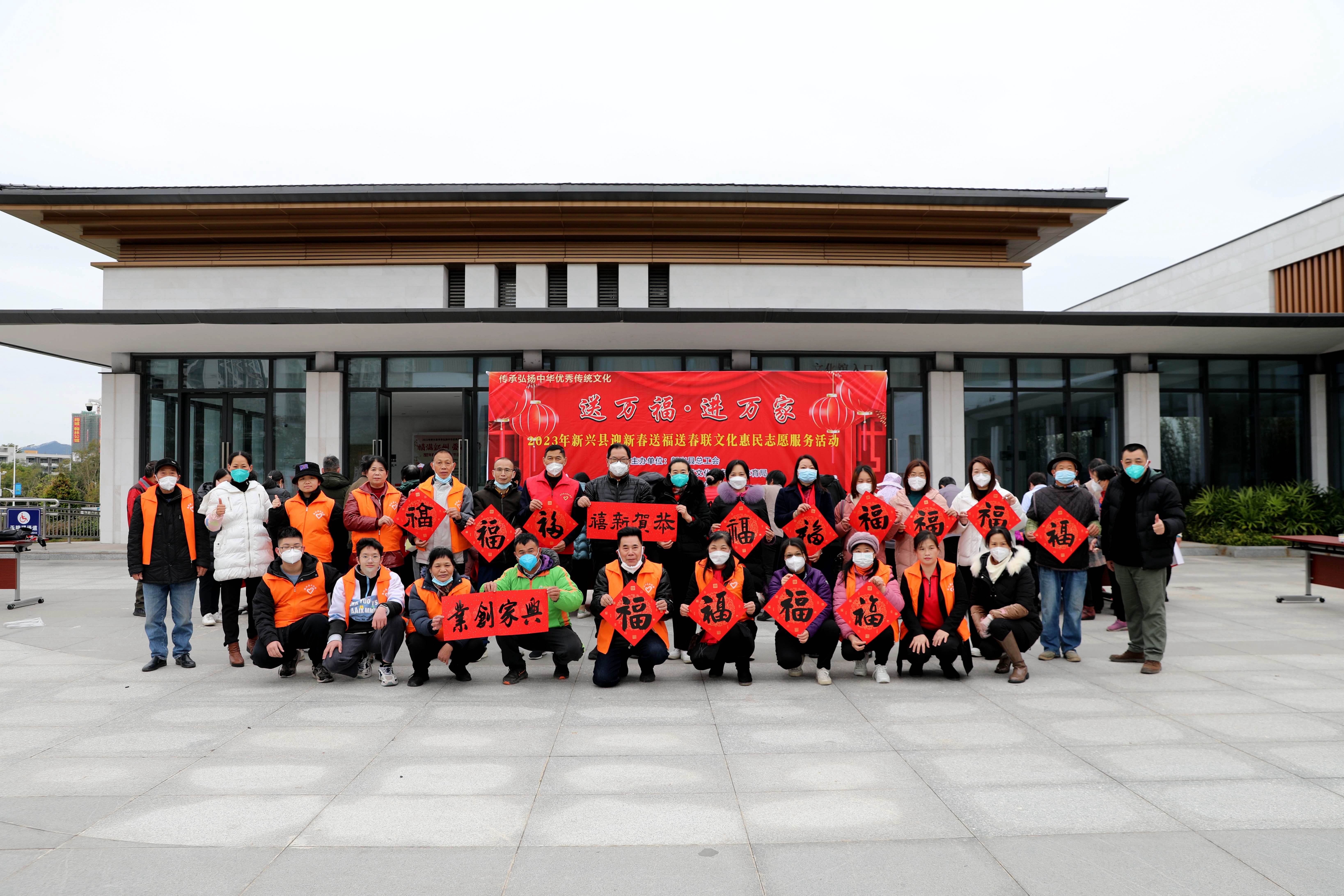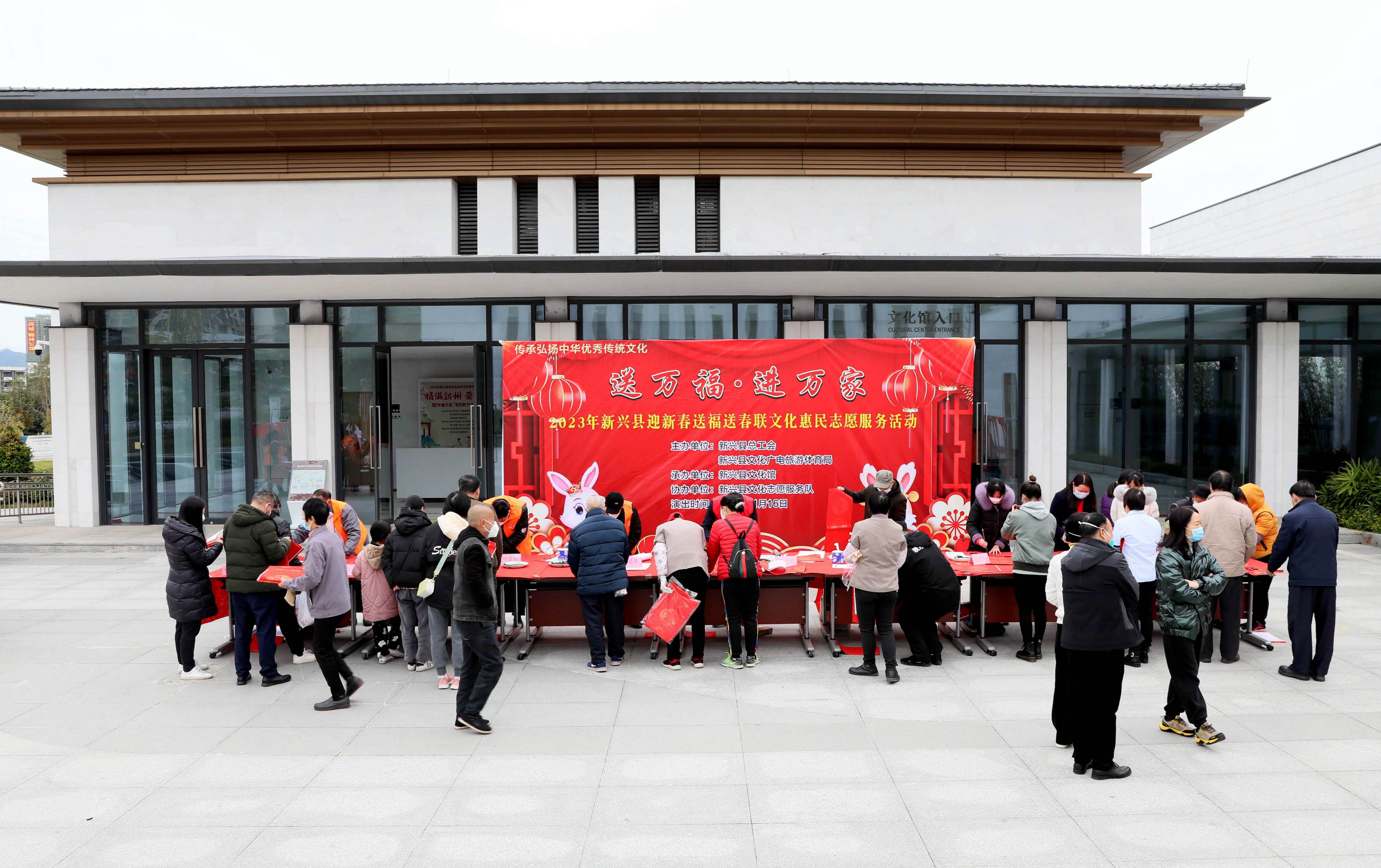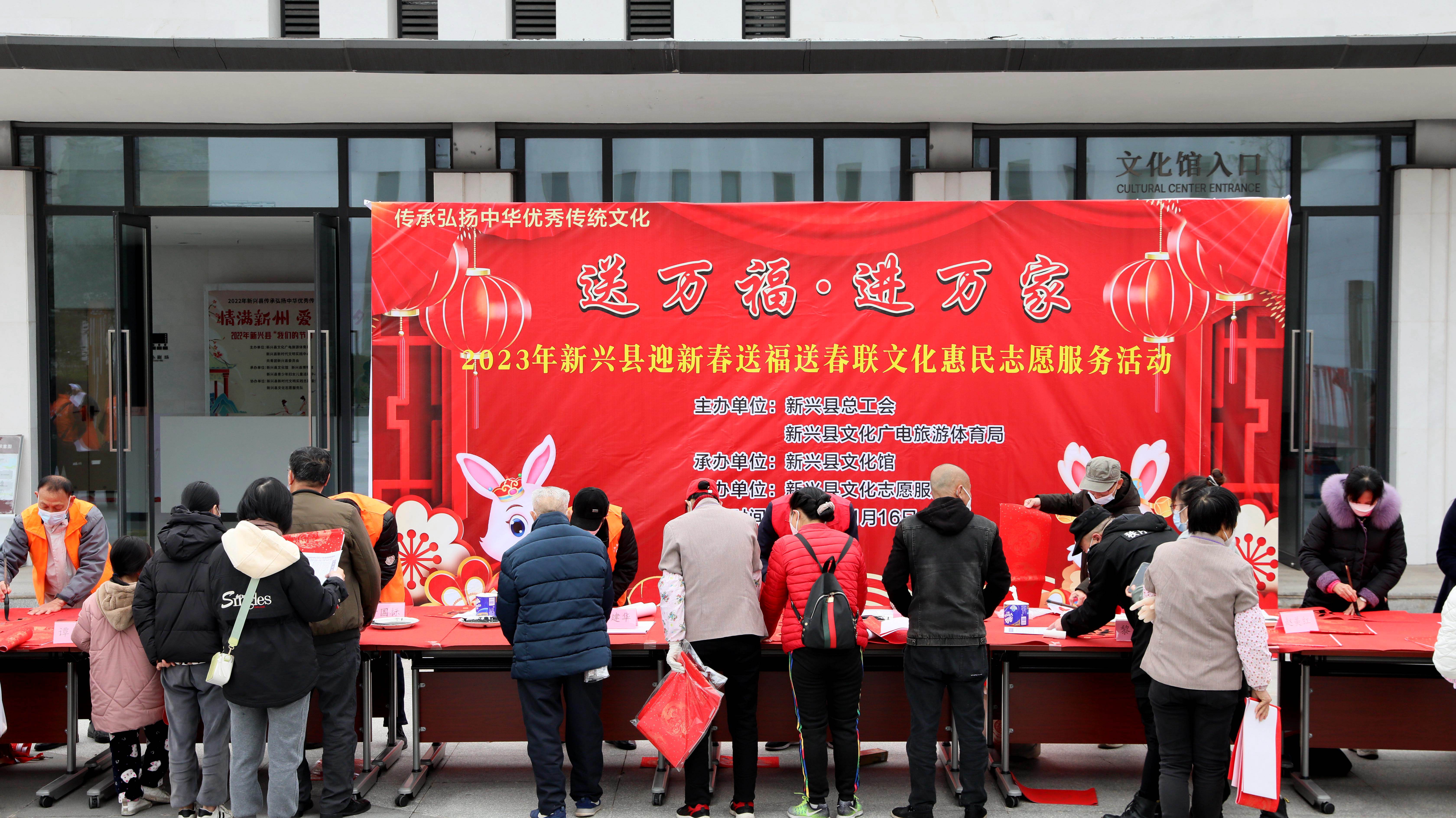 新春将至,为了大力弘扬中华民族优秀传统文化,营造欢乐祥和、喜庆热烈的节日氛围,由新兴县总工会、新兴县文化广电旅游体育局主办,新兴县文化馆承办,新兴县文化志愿服务队协办的2023年新兴县贺新春系列活动于1月16日正式启动,首场送万福 进万家——2023年新兴县迎新春送福送春联文化惠民志愿服务活动在县文化馆小广场举行,送福送春联到广大职工群众身边,让广大职工群众感受到春节的喜庆氛围,展现兔年新年新气象。