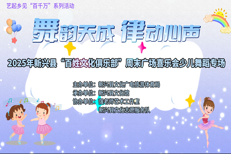 为展现我县少年儿童的艺术风采,促进少儿美育发展,12月7日晚,由新兴县文化广电旅游体育局主办,新兴县文化馆承办,强老师艺术工作室、新兴县文化志愿服务队协办的艺起乡见“百千万”系列活动“舞韵天成 律动心声”——2025年新兴县“百姓文化俱乐部”周末广场喜乐会少儿舞蹈专场在县文化馆报告厅欢乐举行。