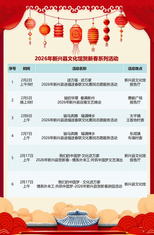 为弘扬中华优秀传统文化,丰富人民群众春节期间节日文化生活,2026年新兴县文化馆贺新春系列活动如下:
