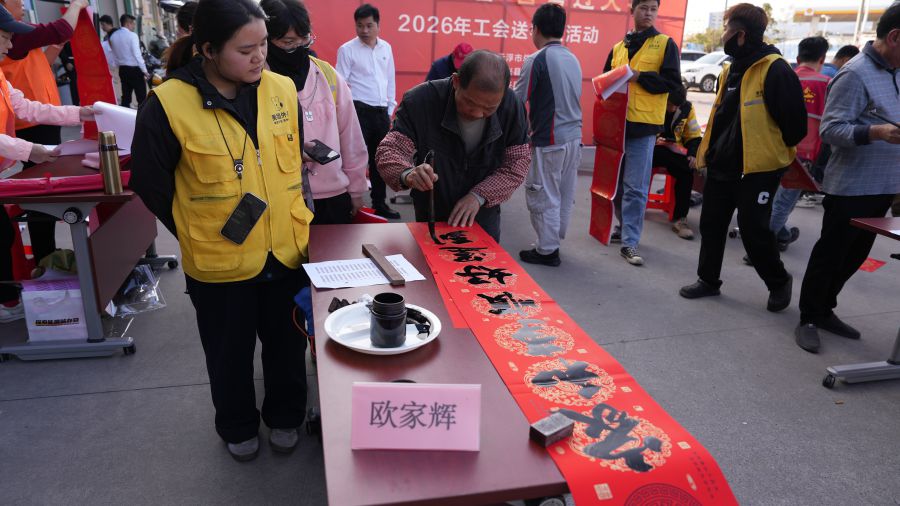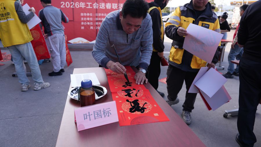 活动现场洋溢着浓厚的节日气息与人文温情。书法家们铺开红纸,挥毫泼墨,将美好的祝愿凝于笔端。一副副寓意吉祥、翰墨飘香的春联,一个个饱满圆润、神采奕奕的“福”字接连呈现,承载着对职工辛勤付出的敬意和对新岁的美好祈愿。忙碌在工作一线的快递、外卖职工们纷纷利用间隙来到现场,或挑选心仪的联句,或驻足欣赏书法创作,或与书写者交流新年期望。火红的春联映照着大家喜悦的笑脸,活动现场暖意融融,成为冬日里一道温馨动人的风景线。活动共计为职工们书写赠送了300副春联和150多个“福”字。